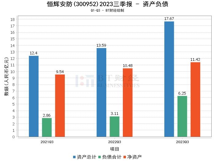 在资产负债方面,恒辉安防2023年三季度的总资产为17.67亿元,相比上年度末的15.12亿元增长了16.9%。负债合计为6.25亿元,相比上年度末的4.44亿元增长了40.54%。净资产为11.42亿元,相比上年度末的10.68亿元增长了6.92%。资产负债率为35.37%,相比上年度末的29.37%有所上升。这些变化主要是因为公司利用闲置资金购买了更多的理财产品,预付了更多的原材料、五金等采购款,以及新增了贷款。