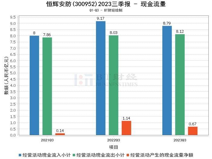 在现金流量方面,恒辉安防2023年三季度的经营活动产生的现金流量净额为6727.31万元,相比上年同期的1.14亿元下滑40.74%。经营活动现金流入小计为8.79亿元,相比上年同期的9.17亿元下滑4.14%。经营活动现金流出小计为8.12亿元,相比上年同期的8.03亿元增长1.12%。这些变化主要是因为公司在本报告期内支付了更多的税费,购买了更多的理财产品,偿还了到期的贷款,以及宣告派发了股利。