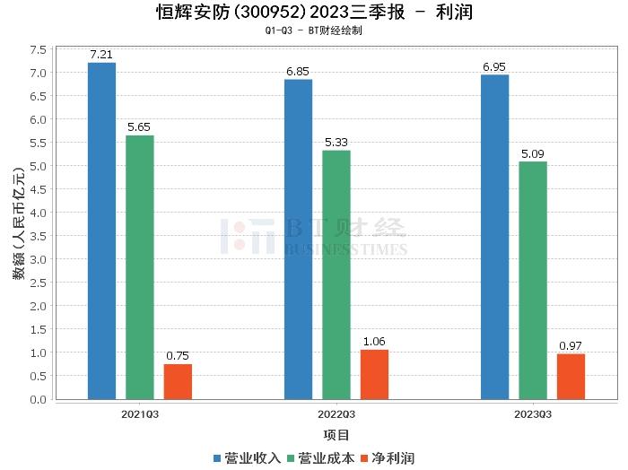 在利润方面,恒辉安防2023年三季度的营业收入为6.95亿元,相比上年同期的6.85亿元微增1.47%。营业利润为1.11亿元,相比上年同期的1.28亿元下滑13.28%。净利润为9721.32万元,相比上年同期的1.06亿元下滑8.11%。这些变化主要是因为公司在本报告期内进行了业务拓展,导致营销部门人员薪酬、差旅及公司展会等费用增加,同时计提了往来款的信用减值,冲回了存货跌价准备。