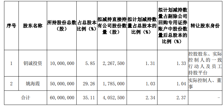 钥诚投资是公司首次公开发行股票上市前为核心员工设立的员工持股平台,持有公司10,000,000股(占剔除回购专用证券账户中股份数量后当前公司总股本的5.85%)。钥诚投资计划自公告披露之日起15个交易日后的3个月内(即2025年10月22日至2026年1月21日期间)以集中竞价或大宗交易方式合计减持公司股份不超过2,267,500股,占总股本的1.31%(占剔除回购专用证券账户中股份数量后公司总股本的1.33%)本次减持主要是基于员工个人的资金需求。