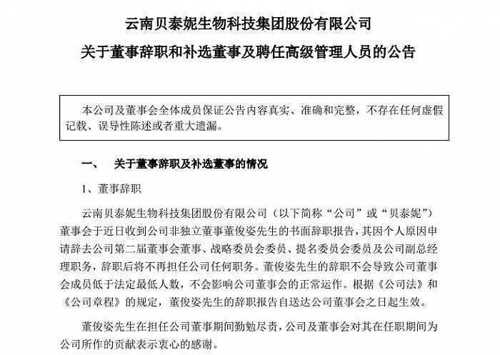 此外,贝泰妮方面还表示,在董俊姿离职前,公司与其已进行了良好的沟通,并且在正式公告发布之前,公司已在组织架构上做好了充分的准备,可以平稳过渡,公司经营不会受到影响。