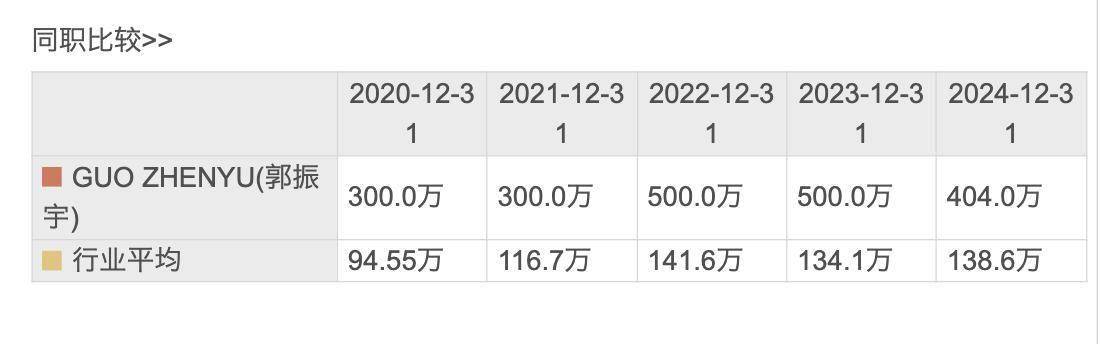 根据披露的薪酬数据,郭振宇近五年从公司获得的税前报酬呈现波动趋势:2020年及2021年均为300万元,2022年及2023年增至500万元,2024年回落至404万元。这一变化与公司经营业绩及行业环境密切相关。