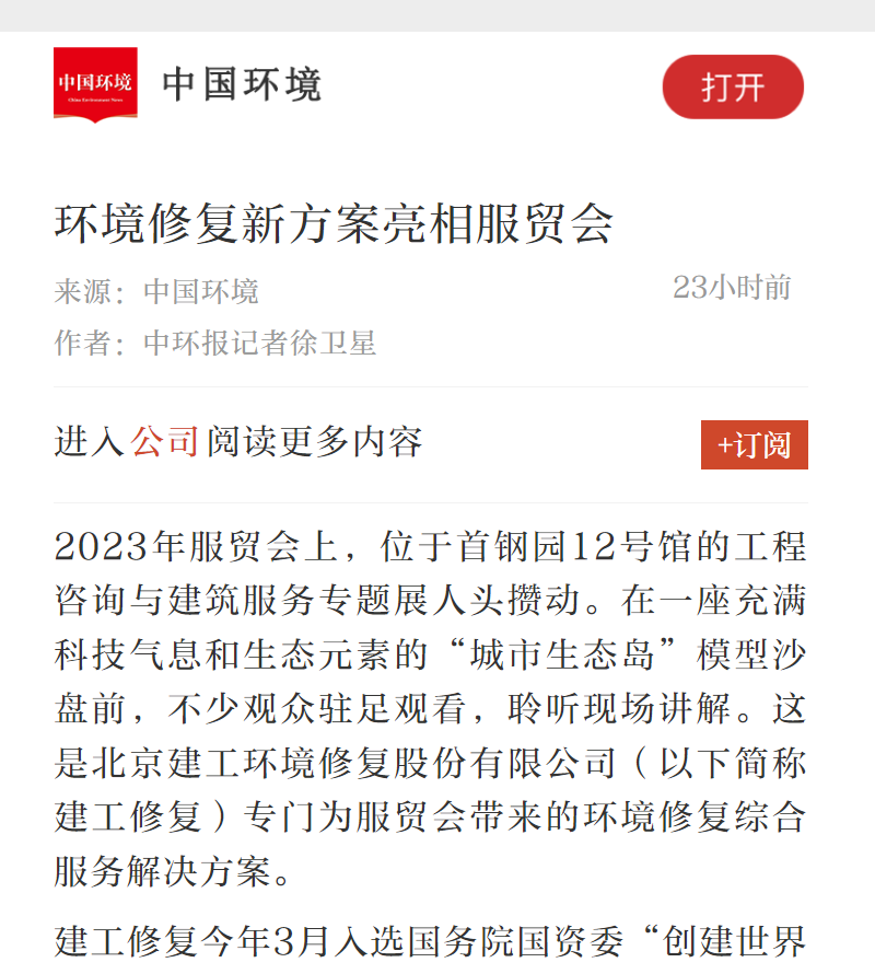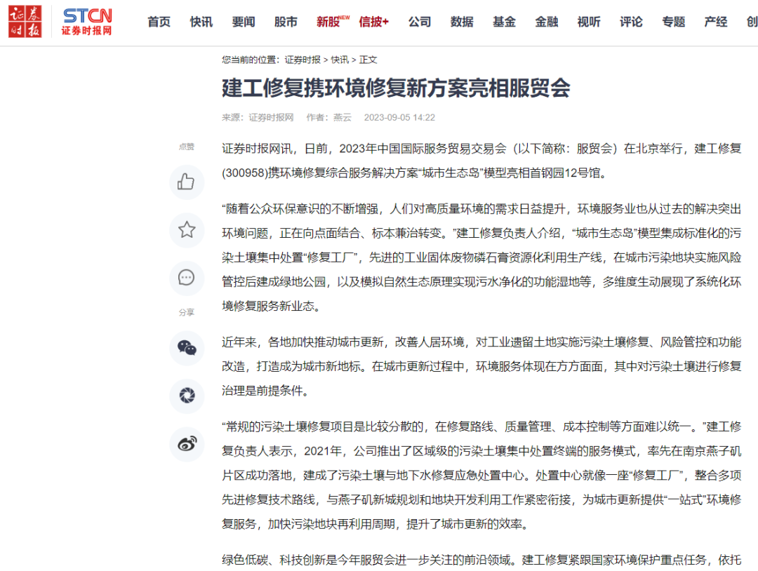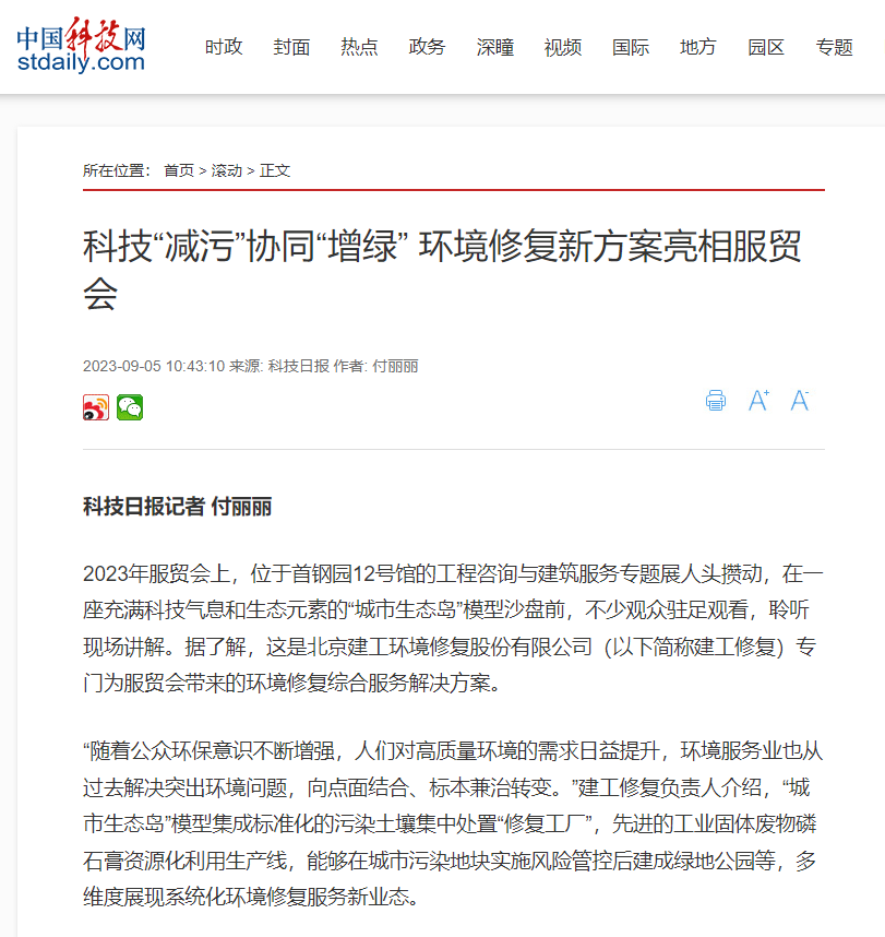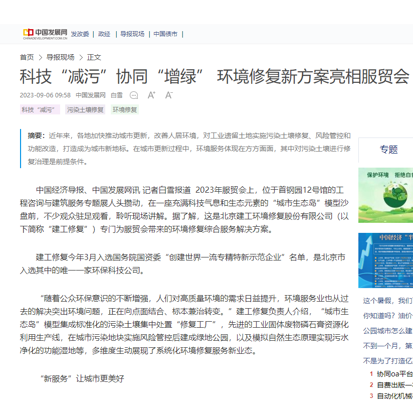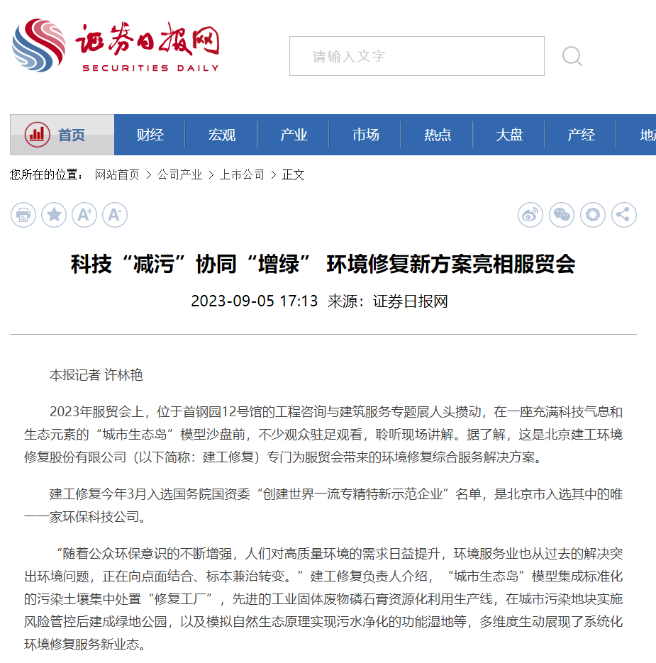 建工修复今年3月入选国务院国资委“创建世界一流专精特新示范企业”名单,是北京市入选其中的唯一一家环保科技公司。本次参加服贸会,建工修复借助“城市生态岛”模型,多维度生动展现了系统化环境修复服务新业态。