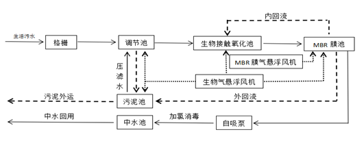 本项目污水处理厂采用“预处理池+MBR膜处理”工艺,以复合膜生物反应器为核心的工艺实现中水回用,出水标准执行《城市杂用水水质》(GB/T18920-2002)和《城市污水再生利用景观环境用水水质》(GB/T18921-2002),中水用于景区绿化、冲厕杂用水和景观环境用水。
