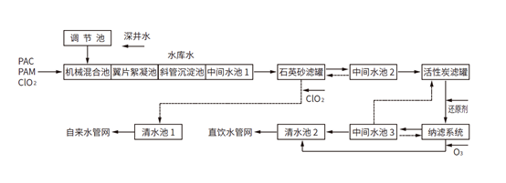 本项目净水工艺采用“混凝+沉淀+砂滤+碳滤+精滤+纳滤+消毒”处理技术,其中自来水出水水质达到《生活饮用水卫生标准》(GB5749-2006),直饮水出水水质达到《饮用净水水质标准》(CJ94-2005)。