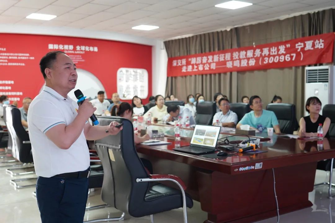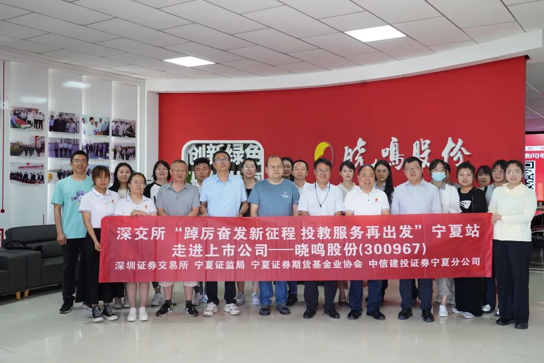 6月20日,由深交所、宁夏证监局、宁夏证券期货基金业协会主办的“踔厉奋发新征程投教服务再出发”宁夏站,走进上市公司——晓鸣股份主题投教活动在我司闽宁智慧农业产业园成功举办,30余名投资者及证券从业者走进晓鸣股份实地观摩调研,公司董事会秘书、副总经理杜建峰,财务总监孙灵芝接待来访。