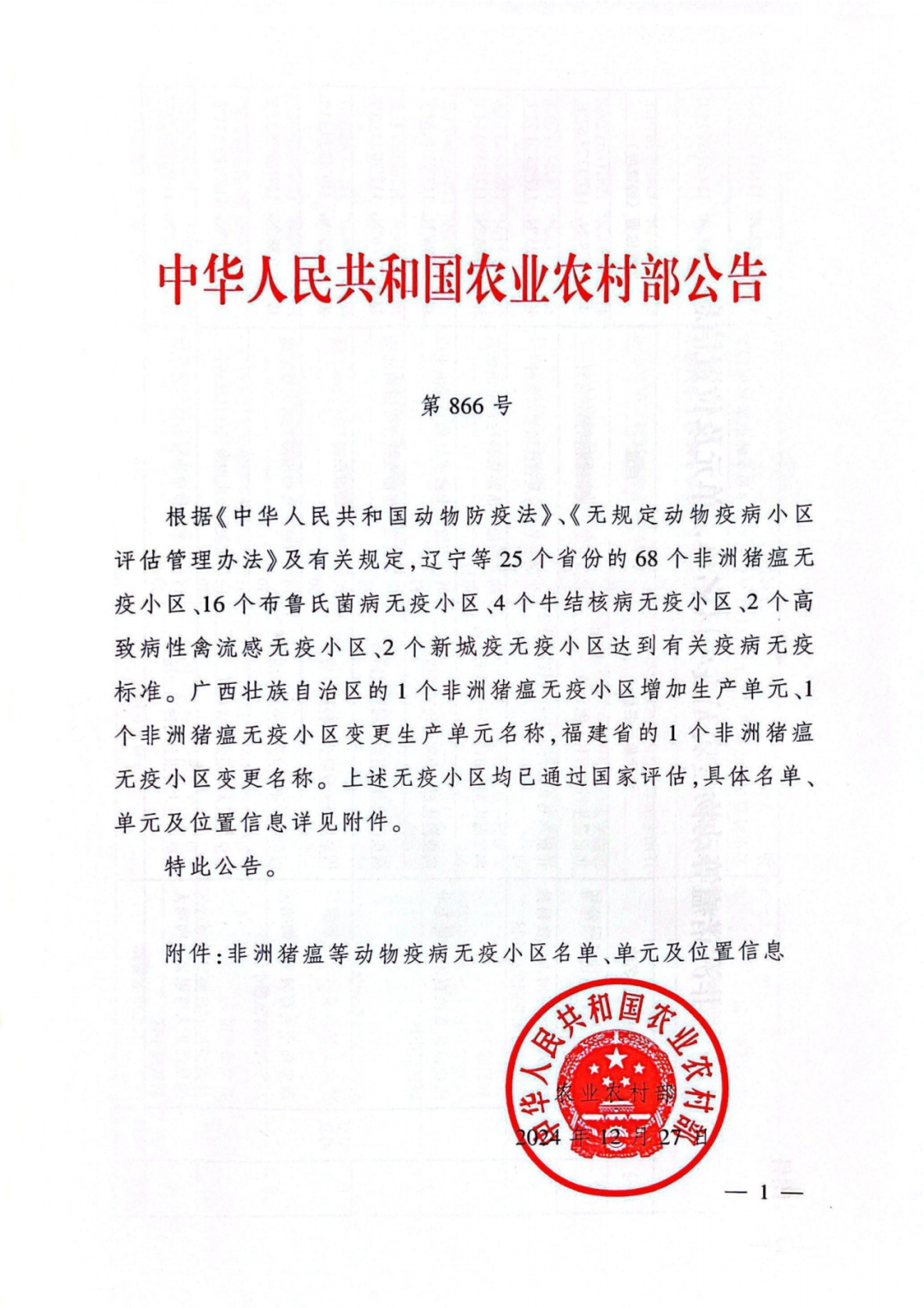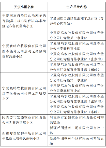 2024年12月27日,农业农村部发布866号公告,宁夏晓鸣农牧股份有限公司红寺堡分公司红寺堡第一事业部、李寨科事业部、东岭育雏事业部、张家沟育雏事业部四个区域顺利通过蛋鸡无高致病性禽流感小区和无新城疫小区评估。这是继2020年青铜峡养殖基地和闽宁养殖基地通过无疫小区评估后,晓鸣股份在无疫小区建设方面的又一重要突破。