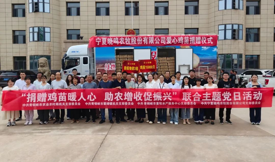 活动中,晓鸣股份党支部向青铜峡市瞿靖镇、邵岗镇、小坝镇、陈袁滩镇、青铜峡镇的30余个行政村捐赠优质鸡苗3.5万只,这批鸡苗将重点发放给各镇监测户、低保户等急需帮扶的群众手中,为他们发展庭院经济搭建起“致富桥”,让“小庭院”变身“增收园”。