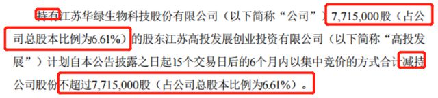 就在6月5日,华绿生物又收到持股6.61%的股东高投发展出具的《减持股份计划告知函》,高投发展拟减持股份数量为合计不超过771.50万股,占公司总股本比例为6.61%。