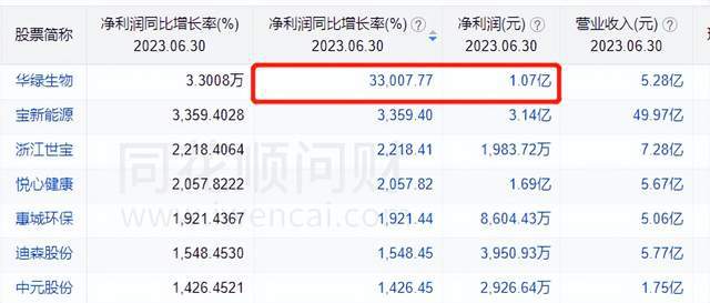 问财显示,目前已披露半年报的公司中,华绿生物净利润1.07亿元,增长率33007%,位列第一位,遥遥领先第二位。