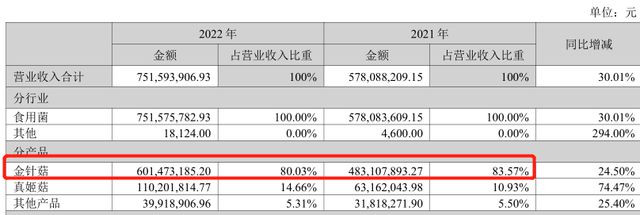 公告显示,2021年和2022年,华绿生物80%以上的营收由金针菇贡献,存在产品单一的风险。