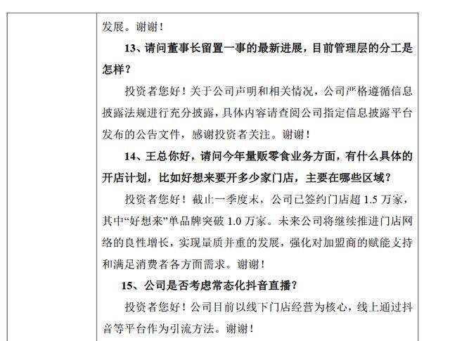 食品安全问题一直是投资者关注的焦点。万辰集团表示,已将安全视为食品行业的生命红线,建立了严格的产品质量管理制度,对上游供应商进行严格把控,并设立了食品安全突发事件的报告和应对机制,确保产品从生产到销售的每一个环节都符合安全标准。