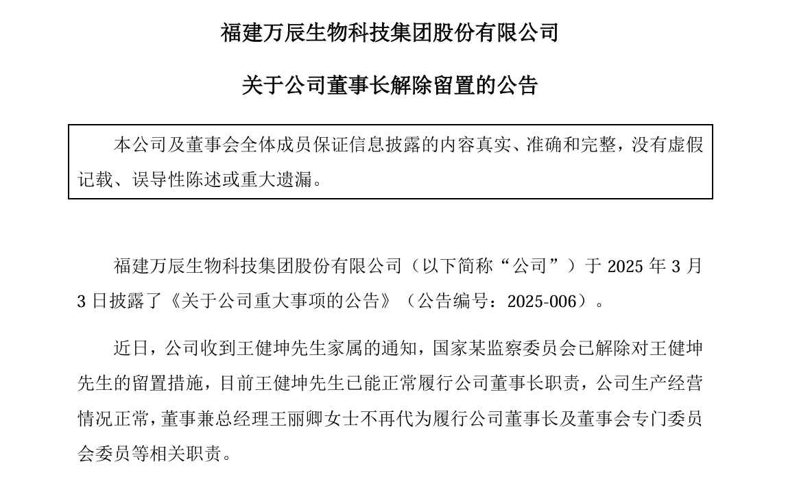 回顾此前,今年3月2日,万辰集团曾发布公告,透露王健坤因涉及某国家监察委员会的立案调查而被留置。当时,公司明确表示所涉事项与公司业务无关,且公司未接到任何协助调查的要求。这一风波引起了市场的广泛关注。
