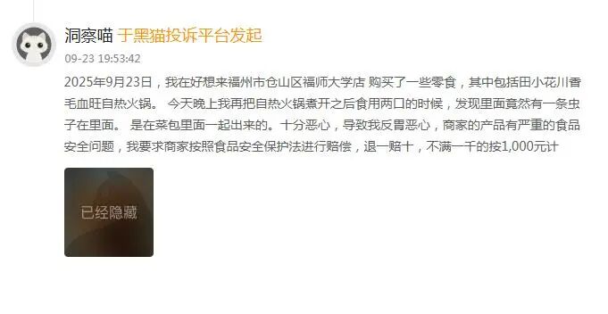 9月23日,一位消费者投诉称,在好想来福州市仓山区福师大学店购买了田小花川香毛血旺自热火锅,在食用过程中发现有虫子。
