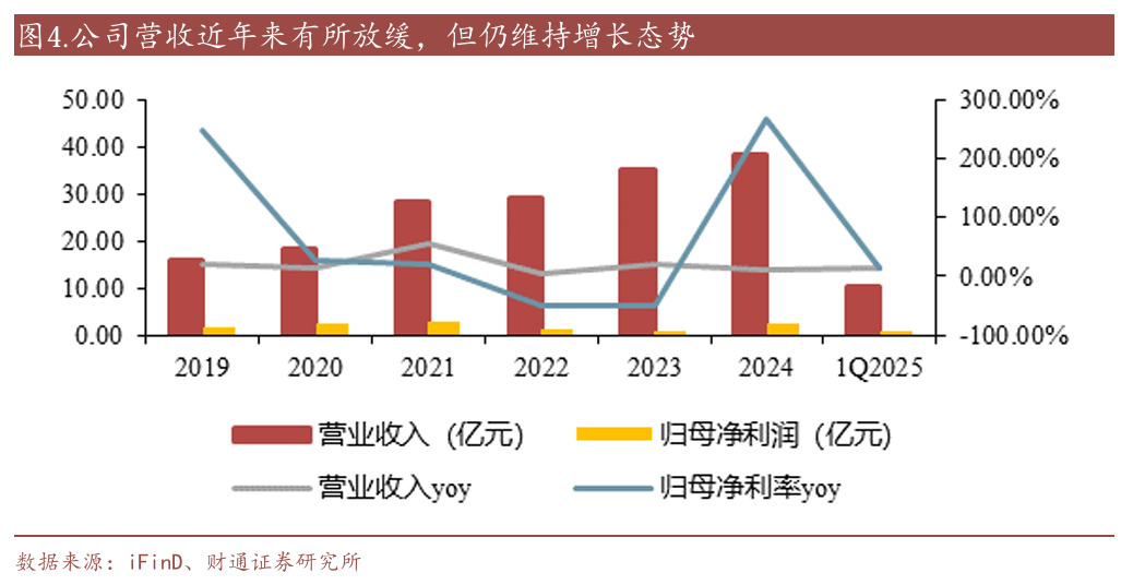 营收维持增长,产品和渠道结构变化明显,“渠道先行”特性明显。从营业收入方面看,公司从2021年上市至今,一直维持较快增长,营收从2019年的15.84亿元提升至2024年的38.35亿元,5年复合增速19.35%。公司维持快速增长,我们认为是行业渗透率的提升,以及公司渠道反应快速所贡献,但营收的结构发生较大变化: