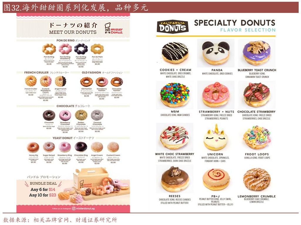 海外市场单品系列化程度高,已成为提升市场竞争力的重要策略。欧洲和北美市场的甜甜圈、挞皮等产品不仅在口味上进行了多样化创新,还在规格、形态上形成了完整的产品矩阵。以挞皮和甜甜圈为例,挞皮品类丰富,美国市场推出了从传统黄油挞皮到全麦、低糖、植物基等多种类型,满足不同消费者需求。甜甜圈系列多元,海外市场的甜甜圈品类已拓展至不同口味的夹心、淋面等多个系列。