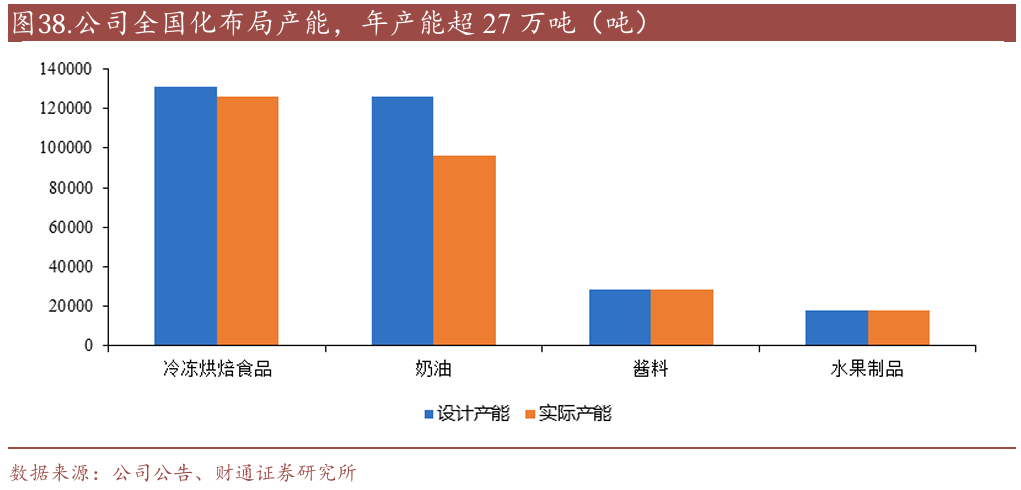产能全国化布局和物流的优化也不断强化公司的竞争优势:公司在国内华南、华东、华北地区拥有3大生产基地、9大厂区,截止2024年底,冷冻烘焙产品年产能13.1万吨,奶油类产品年产能12.6万吨,酱料及水果类制品年产能4.7万吨。2024年,为优化资源配置,体现规模效益,公司对部分水果制品产能进行转移并升级,使佛山地区工厂的水果制品产能更为集中。目前增城总部基地及河南生产基地建设进展顺利,预计将进一步优化产能结构,降低供应链波动带来的影响,为未来发展提供坚实的产能保障。此外,公司也在积极优化物流布局,自建冷链物流车队,将冷冻烘焙食品及烘焙食品原料的物流资源进行了整合,将烘焙食品原料的物流模式调整为与冷冻烘焙食品一致,通过拼车运输的方式进一步降低物流成本。在华南、华东、华北等主要市场建立了区域仓储中心,能够快速响应客户需求,缩短交货周期。