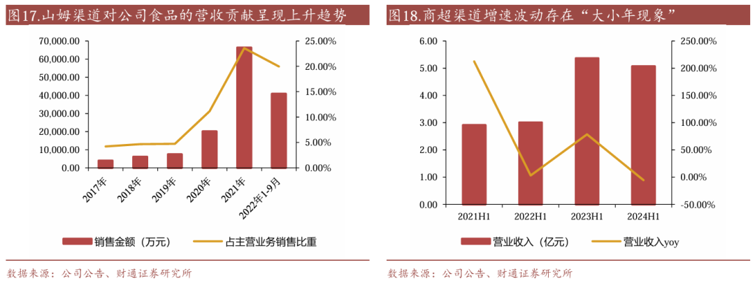 复盘来看,商超渠道增速波动较大,或与业务模式有关。从公司商超渠道的增速上来看,其呈现出较大的波动性,我们认为与商超业务模式有关。一方面,客户新品开发周期较长,通常会经历产品筛选、供应链搭建、市场测试等多个环节,因此每年推出的新品数量和力度可能有所不同。另一方面,客户对新品的推出节奏也有严格的规划,且新品推出后能否引爆也具备一定的不确定性。此外,产品的更迭优化、供应链之间的相互平衡等,也都会影响当年的渠道表现。