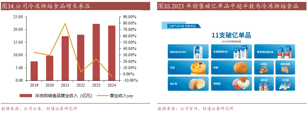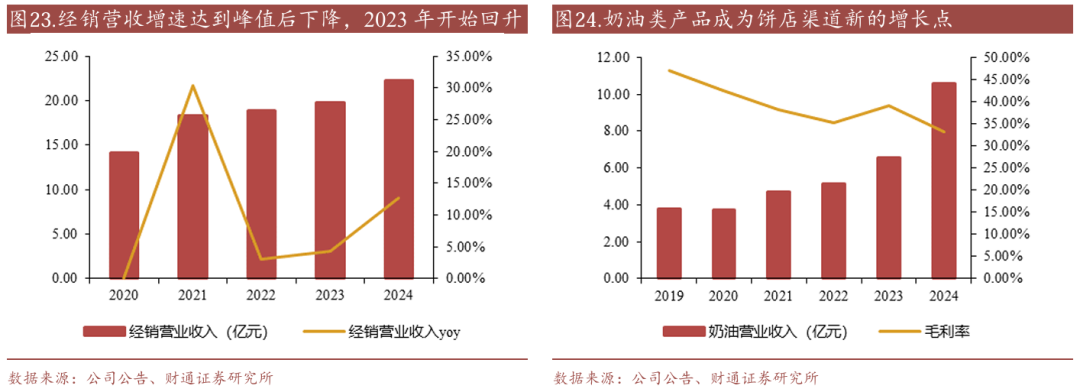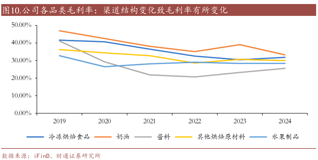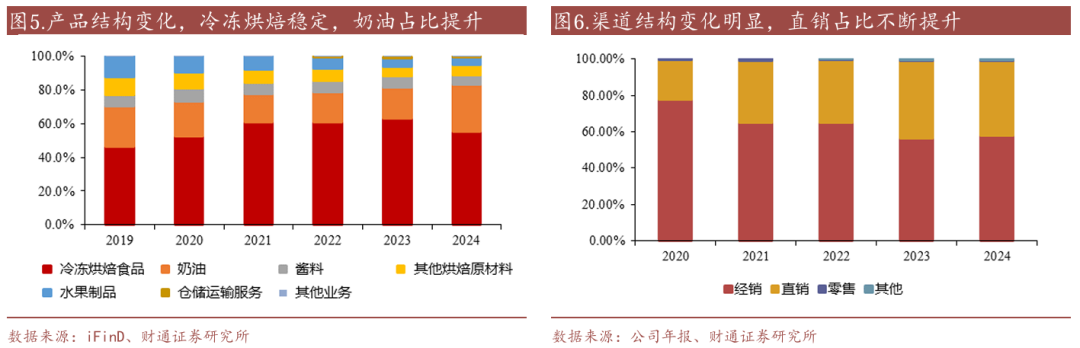 奶油/冷冻烘焙占比从2020年的20.5%/52.8%分别变动至2024年的27.6%/55.6%,我们认为主要是传统烘焙渠道竞争加剧、流量下降,而奶油赛道国产替代和升级趋势显著,公司产品具备较强竞争优势。