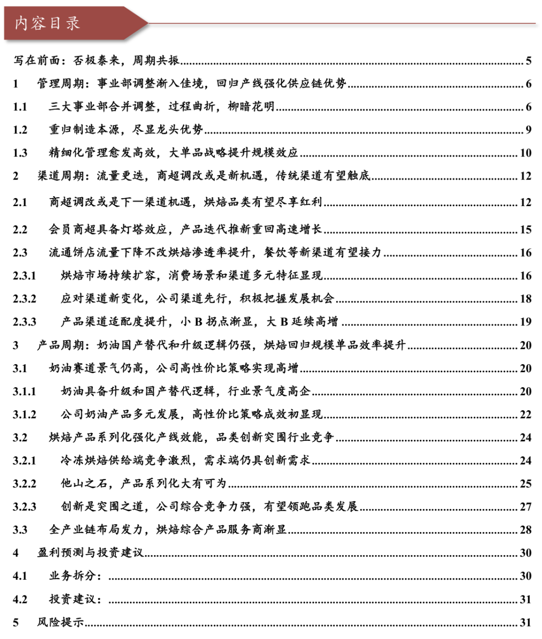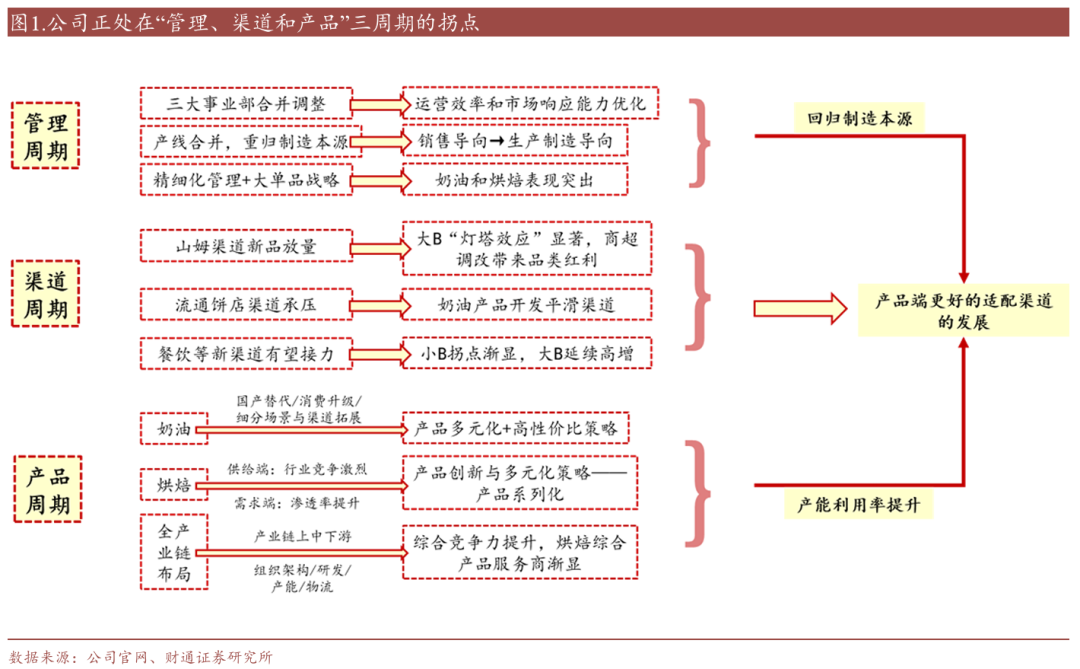 管理改善逐步显现,有望迎来“管理、渠道、产品”三周期共振。公司是冷冻烘焙和奶油行业的龙头,近年来随着内部调整以及外部市场变化,公司业绩有所波动。随着调整的收效,公司逐步走出调整低谷,有望迎来周期拐点。