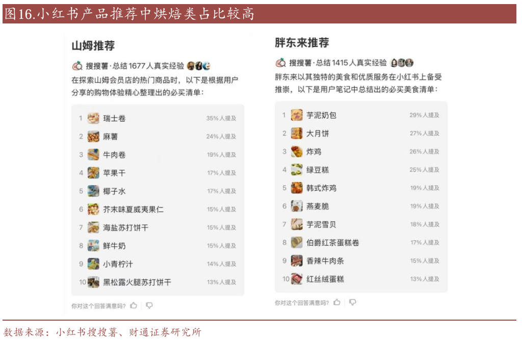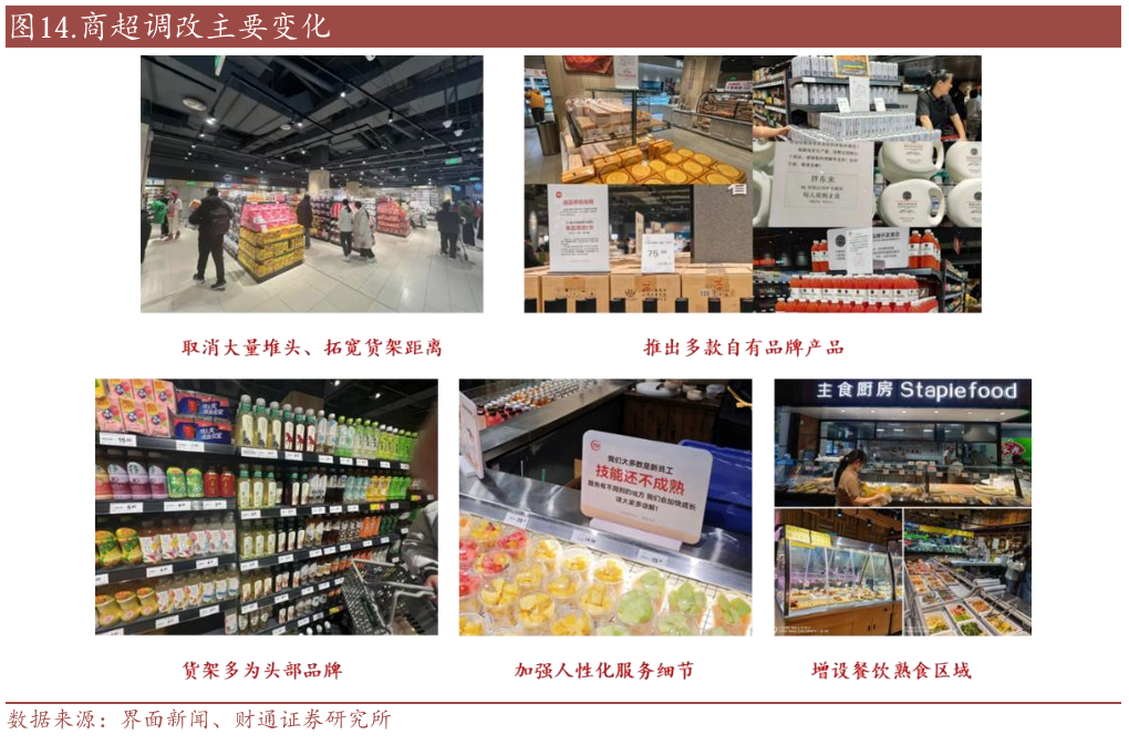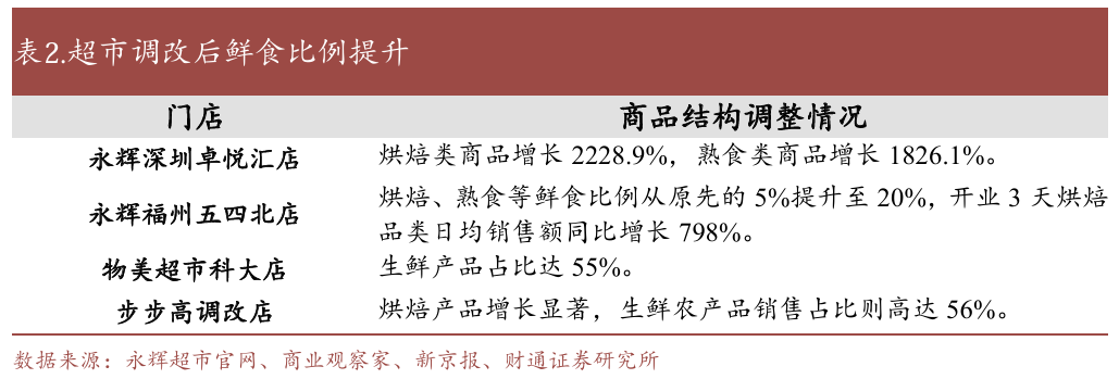 优化商品结构,熟食、烘焙和生鲜产品流量爆品效应显著。在商超调改中,熟食、烘焙、生鲜销售展区往往聚集了最多人流,这些流量爆品的引入显著提升了商超门店的客流量,从而带动商超销售额的增长。诸如物美超市多点烘焙系列下的“新疆果子大面包”成为爆款单品;小红书等社媒平台上“山姆必买”等类似词条推荐产品也呈现以熟食、烘焙和生鲜产品高居榜首的态势。究其原因主要是:1)具备强大的引流能力;2)可带动卖场人气和消费氛围;3)具备天然的差异化竞争优势。而依托这些品类,诸多商超调改成效显著。