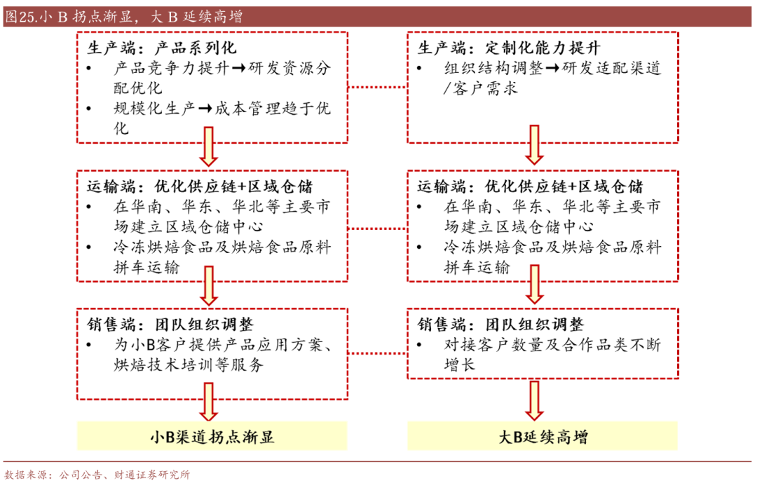 奶油和冷冻烘焙,本质是供应链业务,最后竞争的落脚点在规模效应带来的优势。公司作为to B业务的企业,在小B渠道竞争的过程中,除了看重公司的服务能力,更看重的是品类的矩阵和产品的竞争力,而这些都是经销渠道的核心竞争力。同时,对于大B业务,随着公司产线的调整,能够更好地响应客户需求,提高新品的成功率。