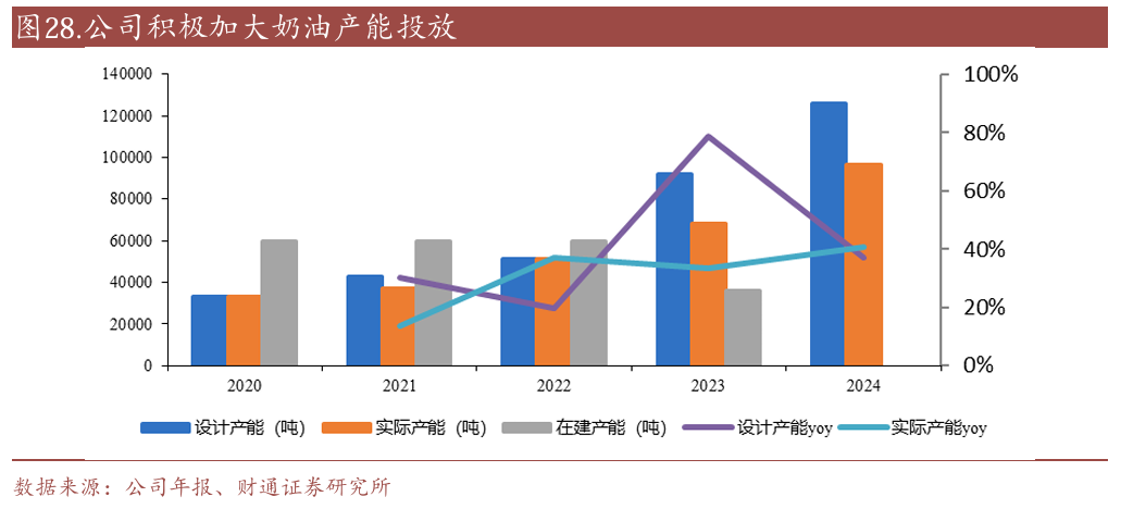 奶油:2024年奶油、酱料、水果制品及其他烘焙食品原料收入占比约44%,同比增长约33%,主要系公司UHT系列奶油产品保持良好增速。受益于高自动化产线、高订单量带来的规模效益,2024年UHT奶油产品实现销售收入超5亿元,带动奶油类产品营收同比增长超60%。