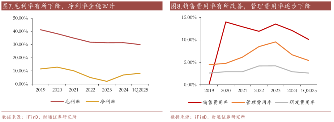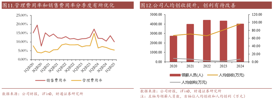 管理费用方面:虽然在2020年至2023年有所上升,从4.78%上升至9.56%,但在2024年回落至6.68%。组织架构调整的过程中管理费用得到持续管控和优化,通过精简流程、提高管理效率等措施,使管理费用得到了有效的控制。同时,股权激励费用的影响也是管理费用变化的主要因素。