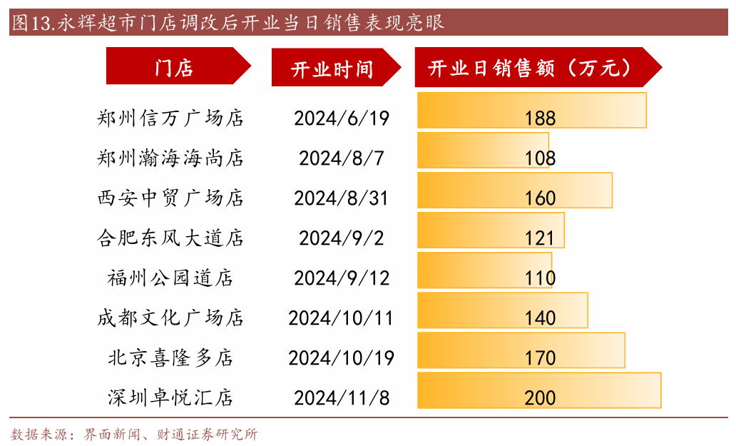 商超调改大势所趋,传统商超积极拥抱新变化。在当前背景下,传统商超纷纷尝试新商超模式,加入调改大军。2024年以来,胖东来“帮扶”步步高、永辉超市多家门店进行调改,效果突出;华润万家、联华超市、银座超市等知名传统超市纷纷开启自主调改。截至2024年底,永辉超市共完成了31家门店的调改。从效果看,在被胖东来调改一个月后的步步高梅溪湖店,2024年5月日均销售额从15万元迅速提升至151万元,日均客流量从2000人次提升到1.26万人次;永辉超市郑州信万店中,胖东来淘汰了近80%的产品,重新梳理后的商品结构达到了胖东来商品结构的90%以上,调改后首日营业销售额达到188万元;自我调改的上海世纪联华中环店,调改后一个月,中环店线下零售总额同比提升近35%,客流同比提升约20%,客单提升14%,商品动销率超过了90%,商品的周转天数也大幅缩短,整体坪效大幅增长。
