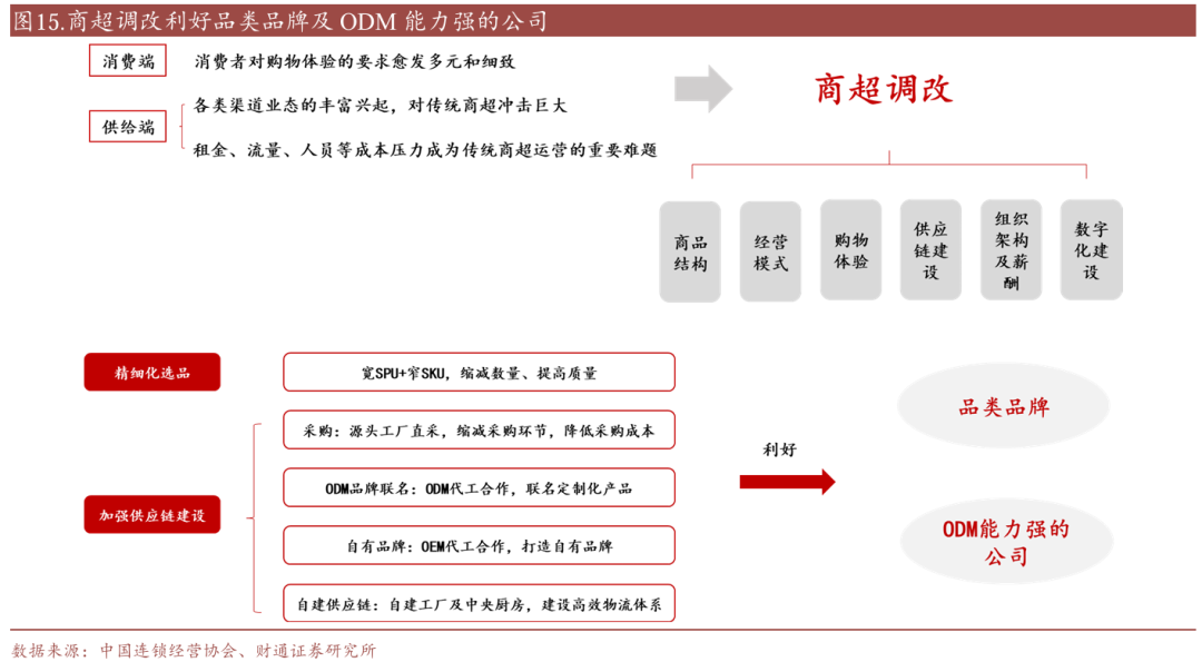 积极关注渠道变革带来的机会,利好品类品牌及ODM能力强的公司。我们在专题报告《商超调改:顺势而为,把握渠道变革新机遇》中提到:2025年需要密切关注线下渠道流量的变化,特别是商超调改带来的机会。商超作为大众品重要消费渠道,在面对消费偏好变化及流量成本压力的挑战时,传统商超纷纷加入调改大军,传统商超调改有望带来显著边际变化。商超调改重要变化之一是商品结构的调整及供应链建设,更为关注产品的商品力及质价比,如堆头数量减少、取消陈列费等渠道费用、减少单一品类SKU数量,利好强品牌力品牌;商超自有品牌占比提升,利好具备稳定高效供应链体系及强ODM能力的公司。