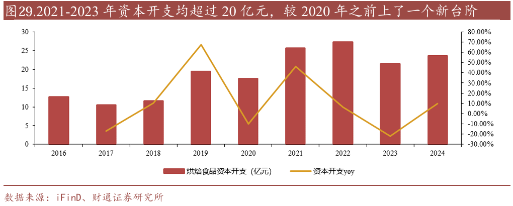 冷冻烘焙行业供给端竞争激烈。近年来,随着市场参与者增加与冷冻烘焙行业的产能持续扩张,市场竞争加剧,部分品类出现供大于求的现象,公司冷冻烘焙品类也阶段性承压。从烘焙食品板块资本开支看,行业在2021-2024年资本开支均超过20亿元,较2020年之前上了一个新台阶。而供给的增加也使得行业竞争有所增加,如挞皮等标准化程度较高的产品因行业新进入者增加,价格战此起彼伏,市场价格持续下降。