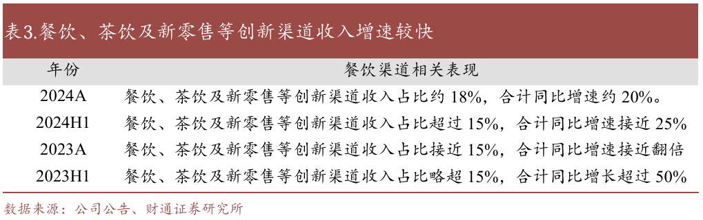 经销/直营渠道从2020年占比77.8%/21.8%分别变动至2024年的57.9%/41.4%,我们判断是市场流量变化,传统渠道流量下降,直营商超和餐饮渠道快速发展,是效率的选择结果。