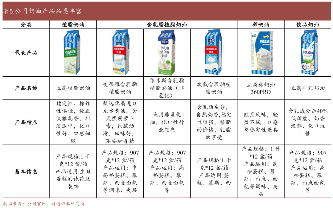 丰富的产品布局:公司奶油产品主要分为稀奶油、含乳脂植脂奶油、植脂奶油和饮品奶油四类。公司的稀奶油产品此前主要以代理进口产品为主,其自主研发生产的新产品UHT稀奶油于2023年5月份上市,并于上市后取得良好的市场反馈,进入自主生产高端乳品奶油领域。含乳脂植脂奶油兼具稀奶油奶香浓郁和植脂奶油塑型能力强的优点,价格居中,是现阶段烘焙奶油市场的中坚产品。植脂奶油是以植物油脂为原料制造,为公司第一代奶油产品,具备打发性好、稳定性强,经济实惠的特点。饮品奶油是2023年上市的新品,应用场景广泛,搭配茶汤、咖啡、水果或汤料等能用于制作奶茶、咖啡、甜品等产品。公司现阶段已经形成了覆盖高中低档次产品结构,具有多种乳脂结构、产品性能、价位和口味,能够充分满足客户不同的应用需求。