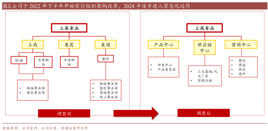调整前,旗下品牌立高、奥昆、美煌分别对应奶油和水果制品、冷冻烘焙食品、酱料系列产品,各事业部由不同销售团队负责。以饼房渠道的终端客户为例,其需与多个销售团队对接不同产品,销售资源未得以充分利用、人力成本高。