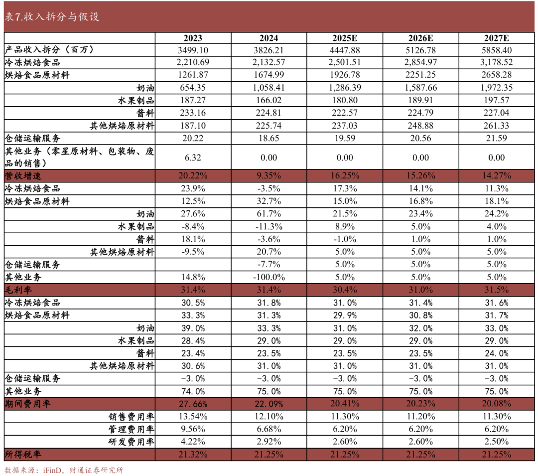 2)毛利率:2025年上半年棕榈油等油脂类原材料价格持续高位运行,对成本端造成冲击。预计2025下半年原料价格有望回落,带动毛利率持续改善。同时考虑到产能利用率的提升,以及管理改善之后的制造效率优化,假设2025-2027年,冷冻烘焙食品毛利率为31.0%/31.4%/31.6%,奶油业务毛利率为31.0%/32.0%/33.0%;其他业务毛利率相对保持稳定。