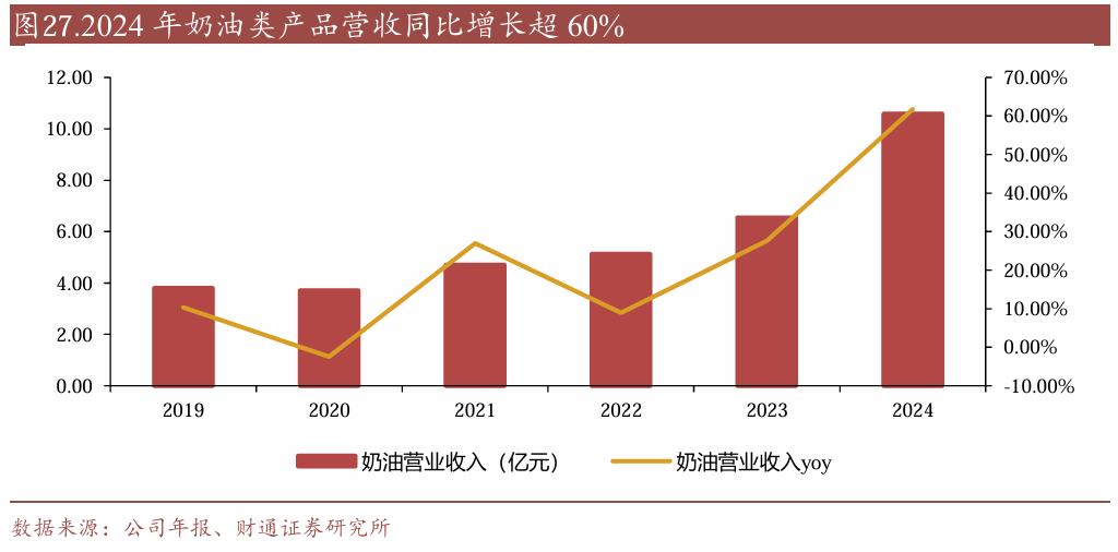 公司奶油业务持续高增,竞争优势持续强化。公司奶油业务从2020年的3.71亿元提升至2024年的10.58亿元,年复合增速30%。公司奶油业务的高速增长,我们认为主要来自:1)公司高性价比的产品策略;2)稀奶油产品的快速布局,强化产品矩阵;3)公司销售团队的服务能力。