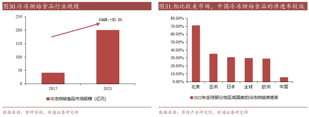 需求端,冷冻烘焙行业仍具备较强的增长逻辑。一方面得益于冷冻烘焙产品品质稳定性高的特点,连锁餐饮及新零售市场需求旺盛,国内连锁咖啡店、便利店数量增长迅速,对标准化供应链的需求提升,冷冻烘焙食品可满足其标准化供应的需求,2023年全国连锁咖啡店数量突破50,000家,其中多数门店采购冷冻烘焙产品。此外,烘焙作为具有营销潜力的产品品类,商超、连锁餐饮等品牌客户有培育具有品牌特点的新品和大爆品的需求,以期差异化。另一方面,冷冻烘焙食品便捷性和成本优势明显,B端客户能获取更高的利润空间,C端客户也能以相对较低的价格购买到产品,需求端的渗透率仍有提升空间。相比欧美市场,中国冷冻烘焙食品的渗透率较低,仅为5%左右,而北美可达到60-70%左右,未来仍有较大发展空间。我国冷冻烘焙食品市场规模从2017年的40.28亿元增长至2023年的198.92亿元,年均复合增长率达到30.5%。
