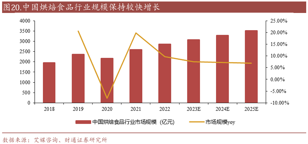 但烘焙市场持续扩容,应用场景多元化是重要增量支撑。根据艾媒咨询发布的《2023年中国烘焙食品行业现状及发展趋势研究报告》,中国烘焙市场规模从2018年的约2000亿元增长至2022年的约2853亿元,年均复合增长率(CAGR)达到8.75%。预计到2025年,市场规模将突破3500亿元,继续保持较快增长。而支撑行业持续增长的核心驱动力之一,来自烘焙食品的应用场景从单一化向多元化的发展。过去烘焙行业的场景相对单一,主要作为主食和早餐的选择之一。随着消费的多元化升级和商家的推广,烘焙也逐渐从日常消耗品转向了消费者高品质生活的象征,其销售场景从单一的饼房,拓展到新式茶饮,自助餐、酒店茶歇等场景。此外,根据《2023年中国烘焙食品行业现状及发展趋势研究报告》,2021年中国烘焙食品的人均消费量仅为7.7千克/年,远低于欧美国家,也低于食饮习惯相近的日本27.8千克/年,烘焙市场仍有较大的增长潜力。