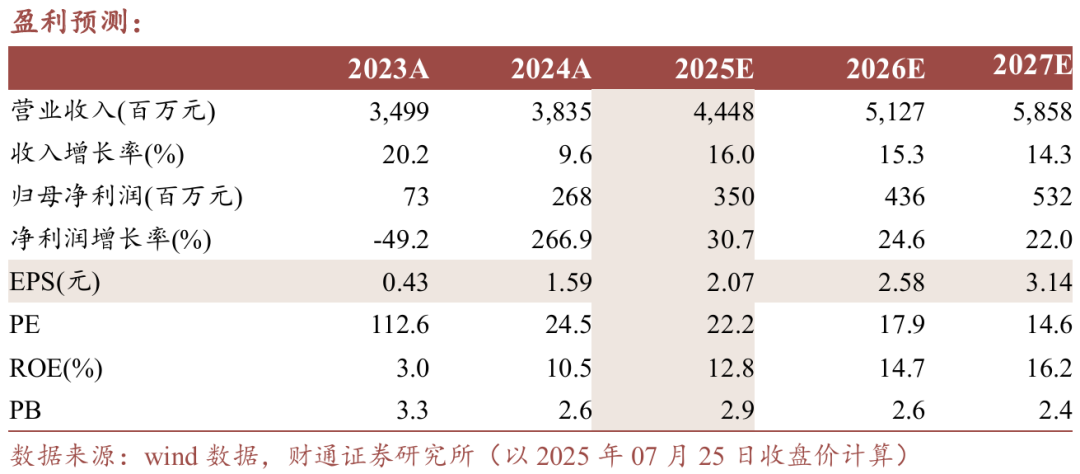 预计公司2025-2027年实现收入44.48/51.27/58.58亿元,同比+16.0%/15.3%/14.3%,归母净利润3.5/4.4/5.3亿元,同比+30.7%/24.6%/22.0%,对应PE 22/18/15x,维持公司“买入”评级。