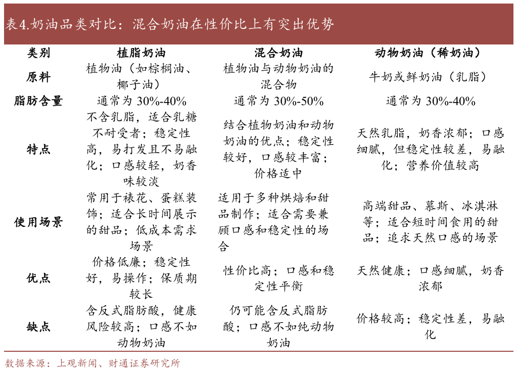 消费升级,中端市场需求快速释放。随着居民收入水平的提高和健康意识的增强,消费者对高品质奶油的需求不断增加。传统的植物奶油因含有反式脂肪酸,逐渐被消费者摒弃,而动物奶油因其天然健康、口感好的特点,受到市场青睐但成本较高。伴随烘焙和餐饮行业的发展,中端市场需求激增,用户对高品质但价格适中的奶油需求迫切。同时在社交媒体的推动下,家庭烘焙变得越来越流行,推动了消费者对高质量高性价比人造奶油产品的需求。