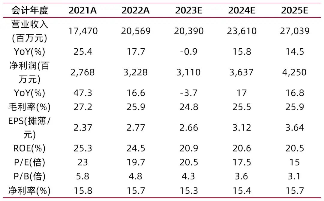 2023年上半年,公司面临品牌客户去库存压力,运动鞋履出货量同比下滑,但受益于高单价的新品牌客户放量及客户自身产品结构变化,产品均价同比显著提升。从国际运动品牌23Q2业绩情况看,库存压力环比改善,但对后续普遍谨慎规划采购以保证健康库存水平,持续跟踪终端需求复苏及品牌库存处理进度。中长期角度,我们继续看好公司凭借持续产能扩张、产品研发能力、及快速的客户响应快反能力提升在核心品牌客户的份额,持续丰富合作客户矩阵。根据公司上半年业绩情况,调整公司盈利预测,预计公司2023-2025年每股收益分别为2.66、3.12和3.64元,8月17日收盘价54.58元,对应公司23、24年PE为20.5、17.5倍,维持“买入-A”评级。