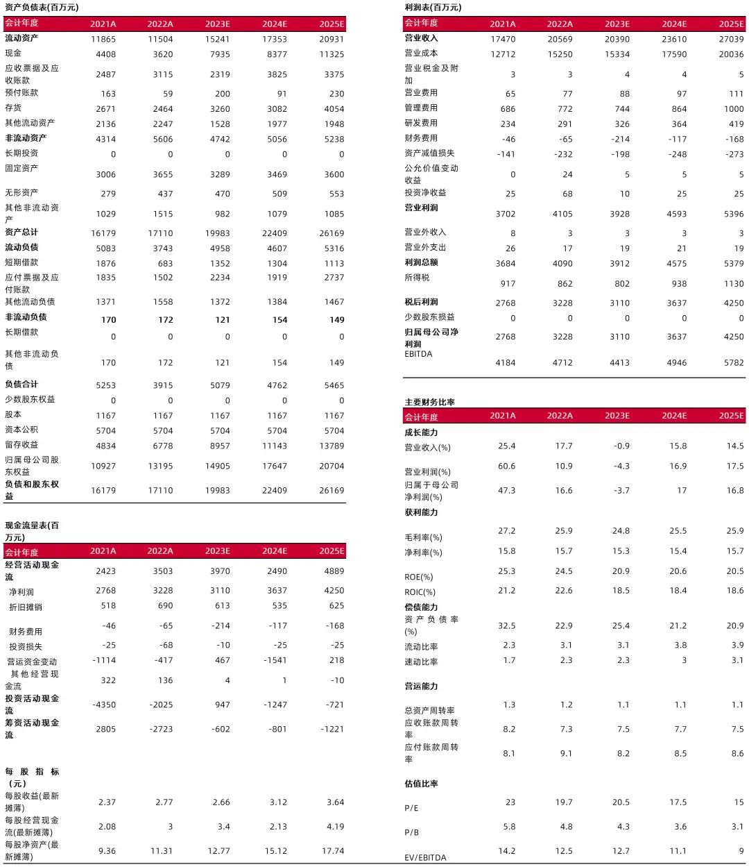 23Q2销售毛利率环比改善,上半年管理费用率显著优化。盈利能力方面,2023H1,公司毛利率同比下滑1.7pct至24.6%,23Q1-Q2毛利率分别为23.34%、25.43%,同比下滑2.3、1.4pct,2季度公司毛利率环比改善2.1pct。费用率方面,2023H1,公司期间费用率合计下滑1.13pct至4.19%,其中销售/管理/研发/财务费用率为0.43%/3.03%/1.59%/-0.86%,同比+0.01/-1.16/+0.06/-0.04pct,综合影响下,2023H1,公司销售净利率为15.8%,同比提升0.02pct。存货方面,截至2023H1末,公司存货28.00亿元,同比下降5.3%,存货周转天数68天,同比减少1天。经营现金流方面,2023H1,公司经营活动现金流净额为13.88亿元,同比增长25.82%,23Q1-Q2经营活动现金流净额分别为7.39、6.49亿元。