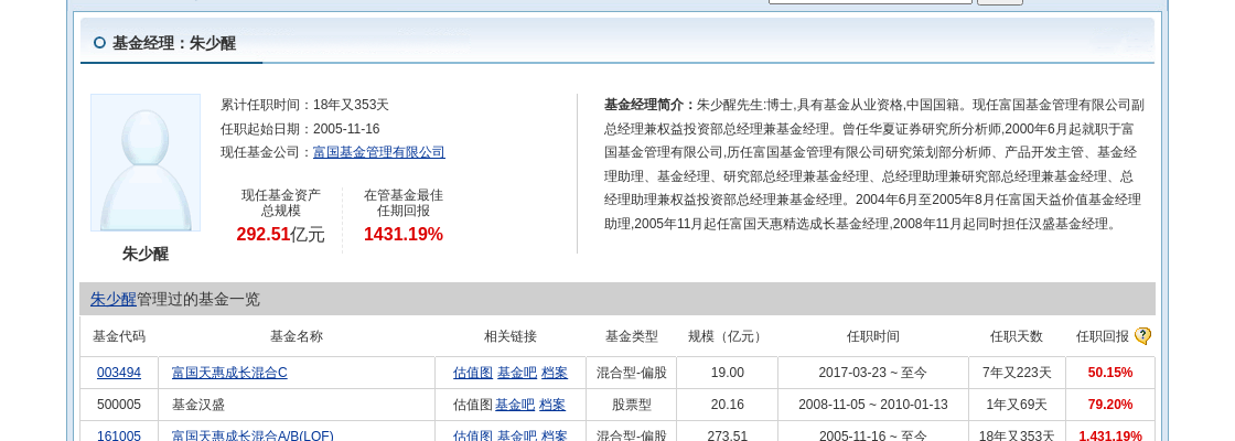 简历显示,朱少醒先生:博士,具有基金从业资格,中国国籍。现任富国基金管理有限公司副总经理兼权益投资部总经理兼基金经理。曾任华夏证券研究所分析师,2000年6月起就职于富国基金管理有限公司,历任富国基金管理有限公司研究策划部分析师、产品开发主管、基金经理助理、基金经理、研究部总经理兼基金经理、总经理助理兼研究部总经理兼基金经理、总经理助理兼权益投资部总经理兼基金经理。2004年6月至2005年8月任富国天益价值基金经理助理,2005年11月起任富国天惠精选成长基金经理,2008年11月起同时担任汉盛基金经理。