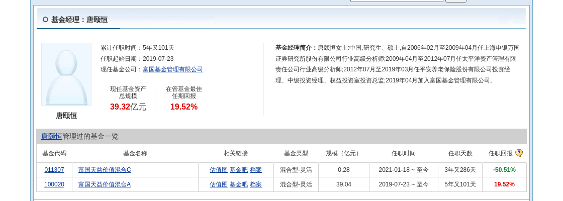 简历显示,唐颐恒女士:中国,研究生、硕士,自2006年02月至2009年04月任上海申银万国证券研究所股份有限公司行业高级分析师;2009年04月至2012年07月任太平洋资产管理有限责任公司行业高级分析师;2012年07月至2019年03月任平安养老保险股份有限公司投资经理、中级投资经理、权益投资室投资总监;2019年04月加入富国基金管理有限公司。