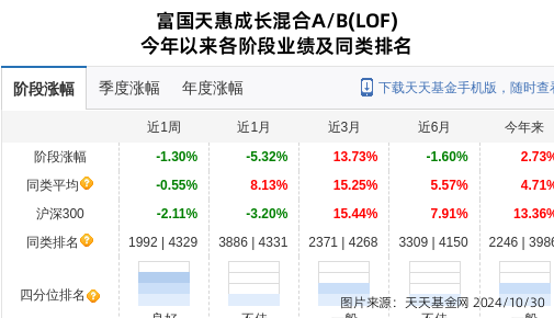 其中,富国天益价值混合A今年以来收益率-0.52%,同类排名1564(总2205),富国天惠成长混合A/B(LOF)今年以来收益率2.73%,同类排名2246(总3986)。