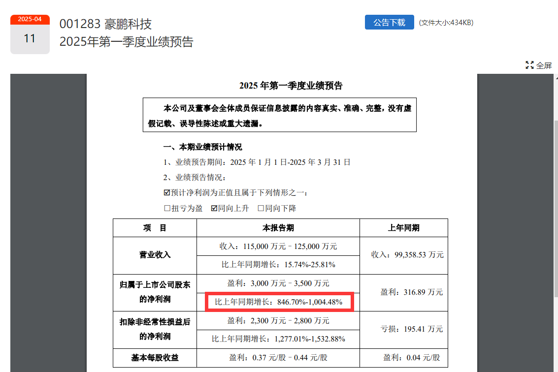 值得注意的是,4月10日晚,多家上市公司披露2025年一季度业绩预告,其中,豪鹏科技预计第一季度净利润同比增长847%~1004%,引发市场关注。
