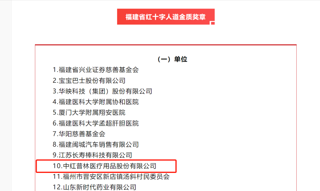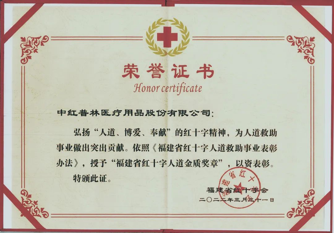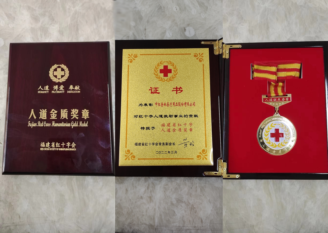 中红普林医疗用品股份有限公司(以下简称:中红医疗)被授予福建省红十字会人道金质奖章,以表彰中红医疗在支持人道救助事业方面做出的贡献。