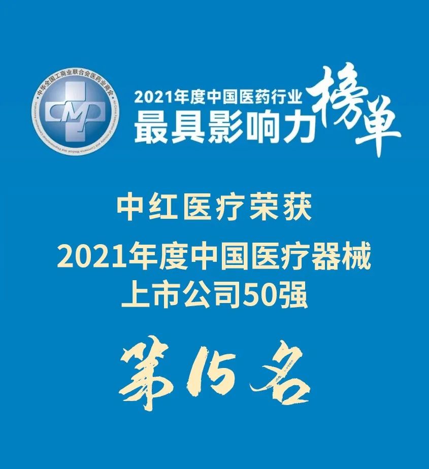 12月8日,全国工商联医药业商会“2021 年度中国医药行业最具影响力榜单”在线上发布。本次榜单共设立11个奖项,中红普林医疗用品股份有限公司(以下简称:中红医疗)荣获“2021 年度中国医疗器械上市公司 50 强”榜单第15名。