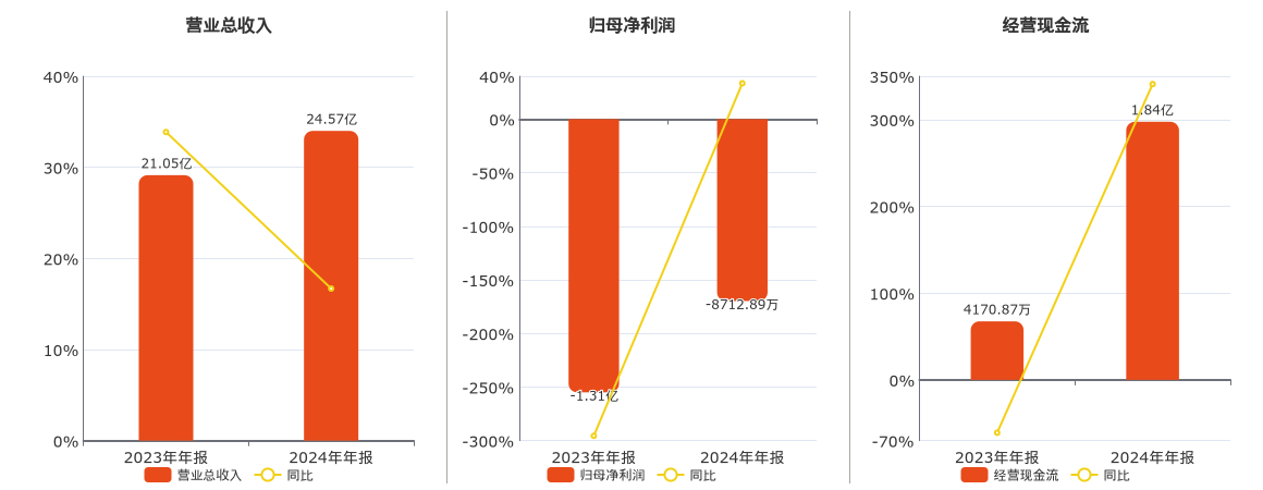公司营业总收入为24.57亿元,较去年同报告期营业总收入增加3.51亿元,实现2年连续上涨,同比较去年同期上涨16.69%。归母净利润为-8712.89万元,较去年同报告期归母净利润增加4374.17万元。经营活动现金净流入为1.84亿元,较去年同报告期经营活动现金净流入增加1.42亿元,同比较去年同期上涨340.94%。
