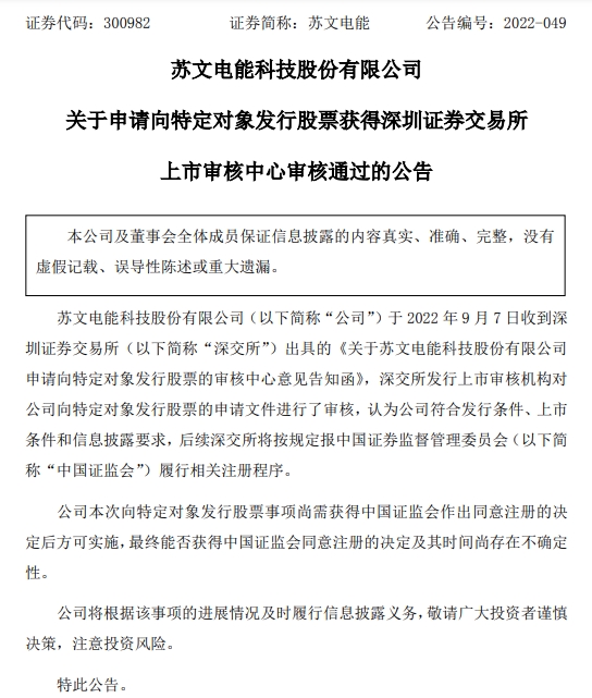 中国经济网北京9月8日讯昨日,苏文电能(300982.SZ)发布公告称,公司于昨日收到深交所出具的《关于苏文电能科技股份有限公司申请向特定对象发行股票的审核中心意见告知函》,深交所发行上市审核机构对公司向特定对象发行股票的申请文件进行了审核,认为公司符合发行条件、上市条件和信息披露要求,后续深交所将按规定报中国证监会履行相关注册程序。